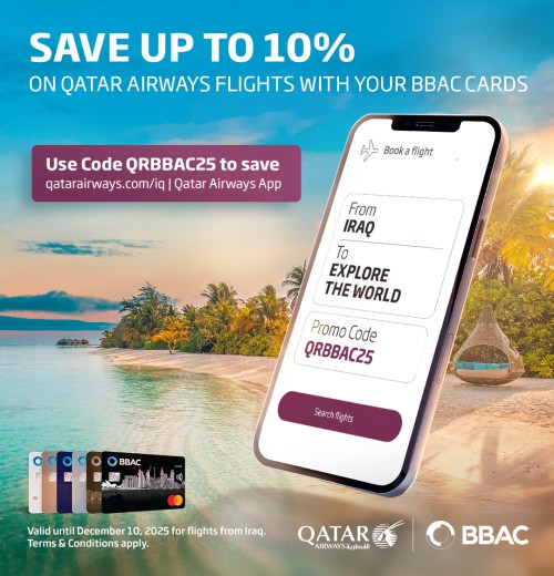 Simply use your BBAC credit or debit card and the promo code QRBBAC25 to book flights departing from any Qatar Airways gateway in Iraq. Explore breathtaking destinations worldwide and experience unparalleled comfort and luxury at Hamad International Airport in Doha during your journey.